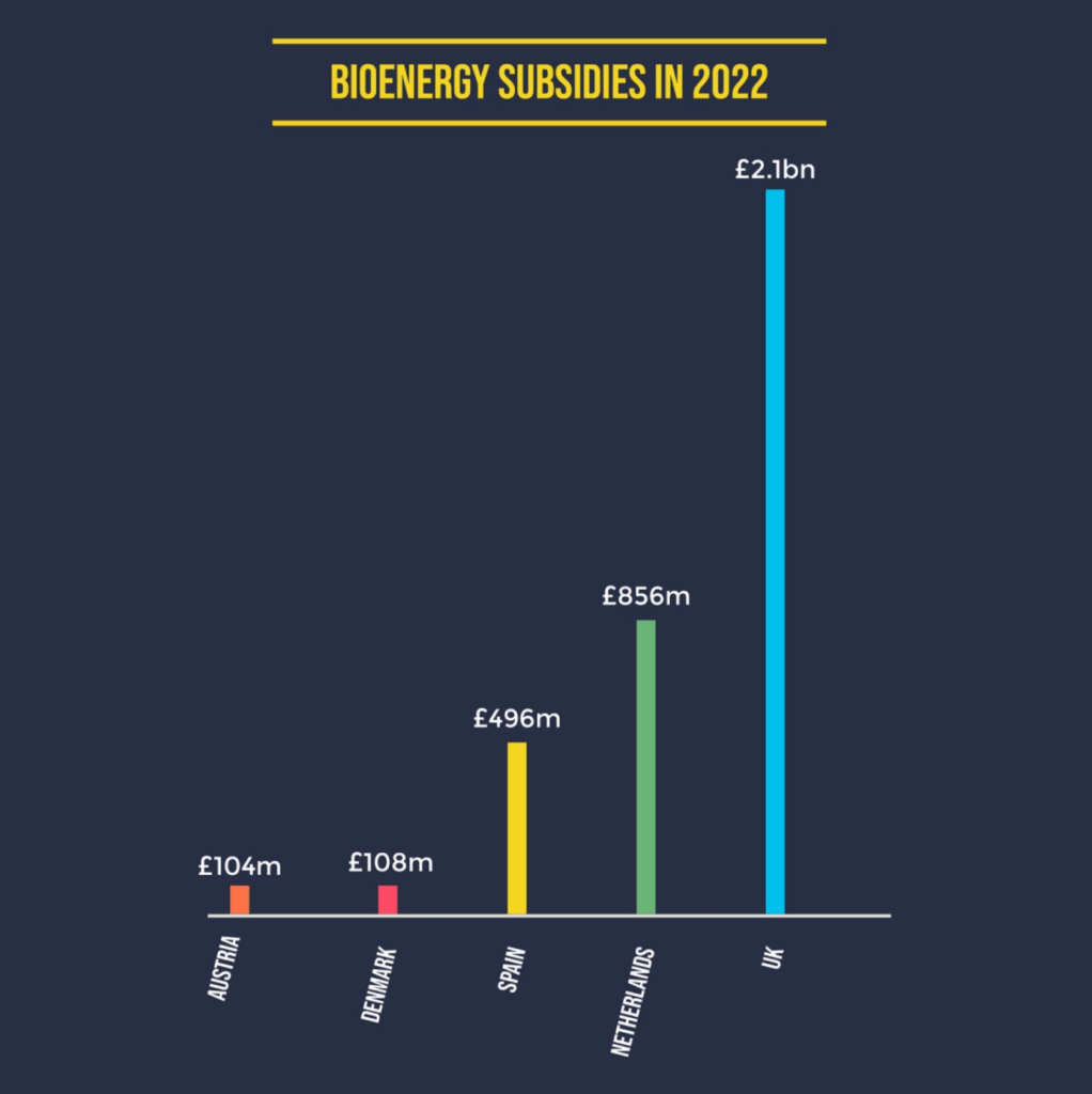The UK is the top subsidiser of bioenergy in Europe. In 2024, Drax power station received £869 million in biomass subsidies. In 2021, the UK spent more than £2.1 billion on bioenergy subsidies, primarily to burn wood imported from overseas forests at Drax Power Station. On average, every person in Britain paid £30 to support the UK bioenergy industry.